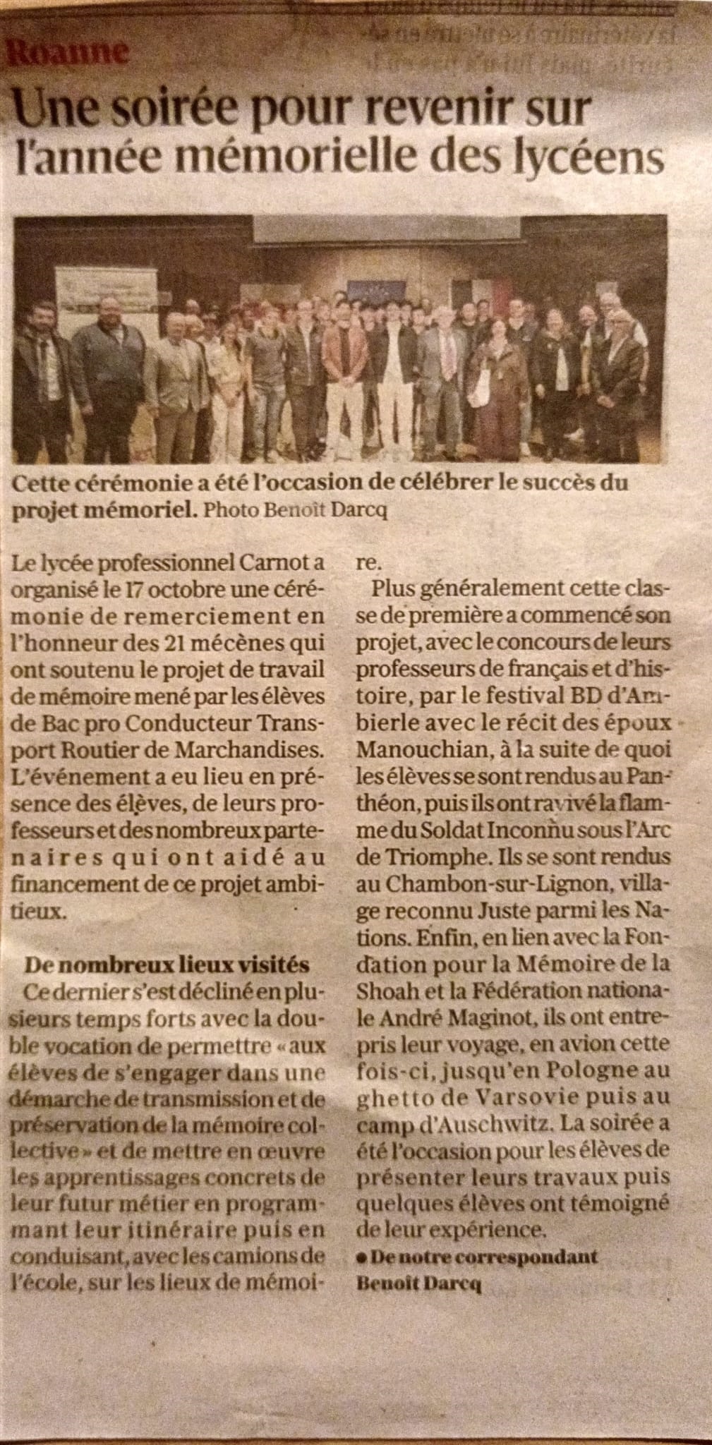 Le 17 octobre, le lycée a organisé une cérémonie de remerciement au Diapason à Roanne, en l'honneur des 21 mécènes qui ont soutenu le projet de travail de mémoire des terminales routiers.